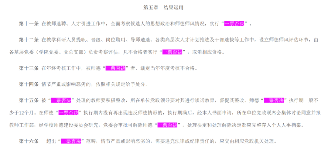 自从教育部印发《新时代高校教师职业行为十项准则》,强调师德师风是评价教师队伍素质的第一标准,要求高校教师评聘、年度考核、职称评聘、推优评先、表彰奖励中严格落实师德评价工作以来,各大高校纷纷制定了师德“一票否决”实施办法,例如中国科学院大学制定的《师德“一票否决制”实施办法》对“师德失范”的具体情形、审查程序和结果运用等做了详细规定。