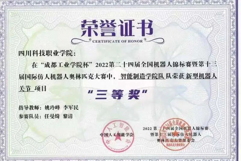 2022年在“成都工业学院杯”第二十四届全国机器人锦标赛暨第十三届国际仿人机器人奥林匹克大赛中荣获新型机器人关节项目三等奖