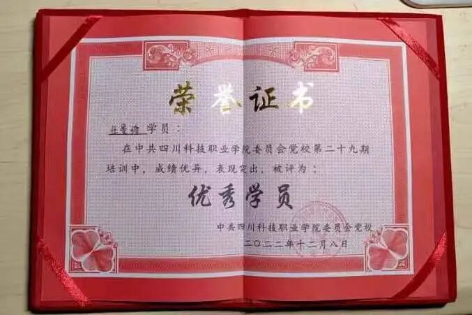 2022年12月8日在中共四川科技职业学院委员会党校第二十九期培训中被评为优秀学员