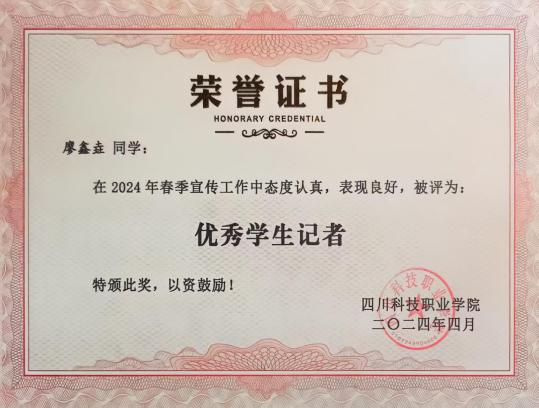 2024.04经四川科技职业学院授予“优秀学生记者”