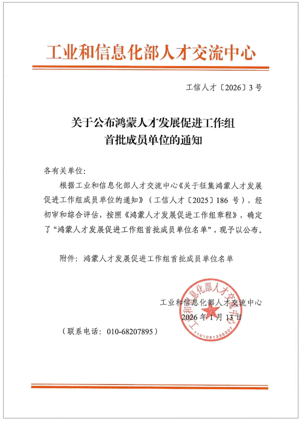 1月13日,工业和信息化部人才交流中心正式公布鸿蒙人才发展促进工作组首批成员单位名单。我校凭借在数字技术人才培养、产教融合等领域的突出表现成功入选,成为四川省唯一入选该工作组的高校,跻身推动鸿蒙生态人才建设的重要一员。