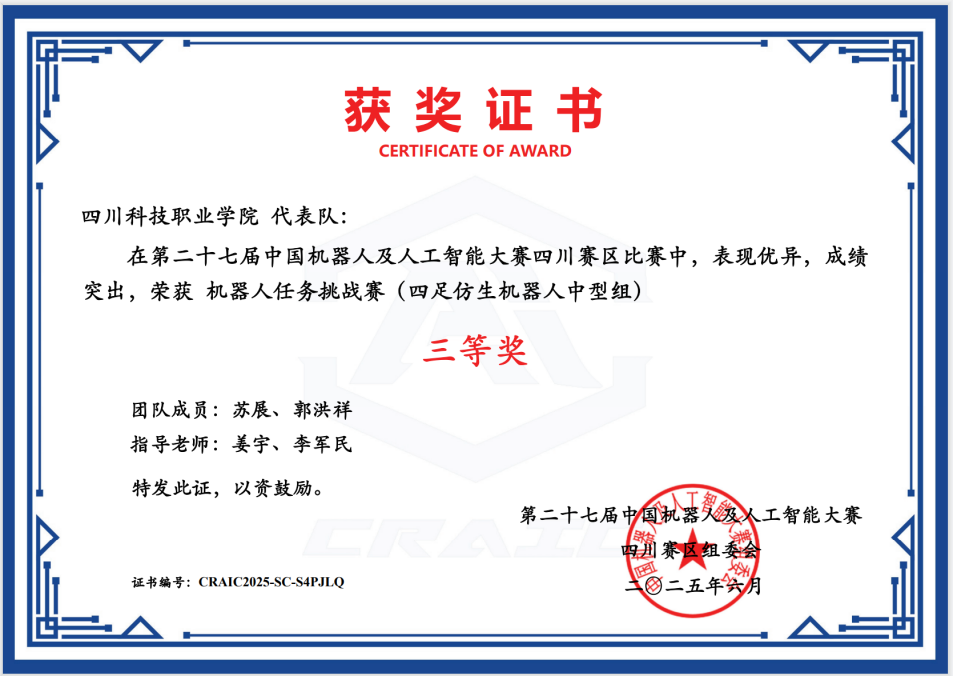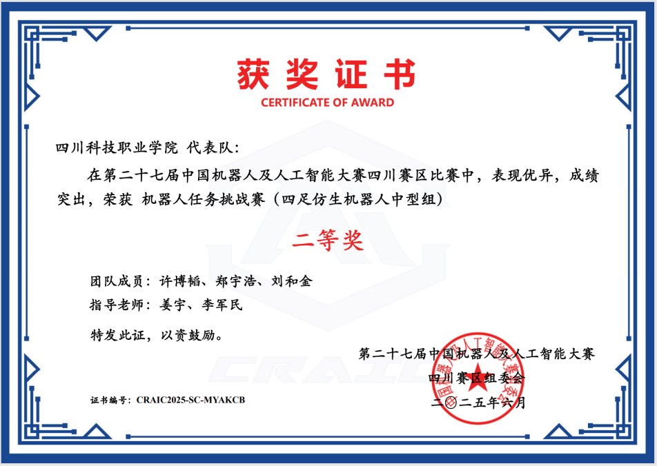 1. 姜宇老师指导 “智能制造 1 队”“智能制造 2 队”,在机器人任务挑战赛(四足仿生机器人中型组) 中分获省级二等奖、省级三等奖,同时斩获国赛优秀奖。