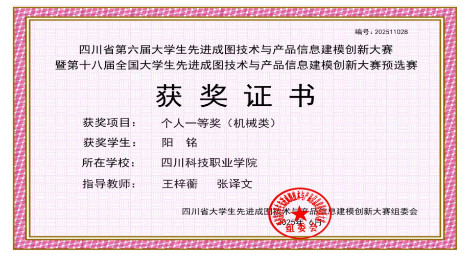 2. 王梓蘅、张译文老师指导阳铭同学,在第十届全国大学生先进成图技术与产品信息建模创新大赛 中荣获一等奖。