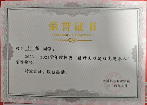 2024年9月在校获得“精神文明建设先进个人”荣誉称号