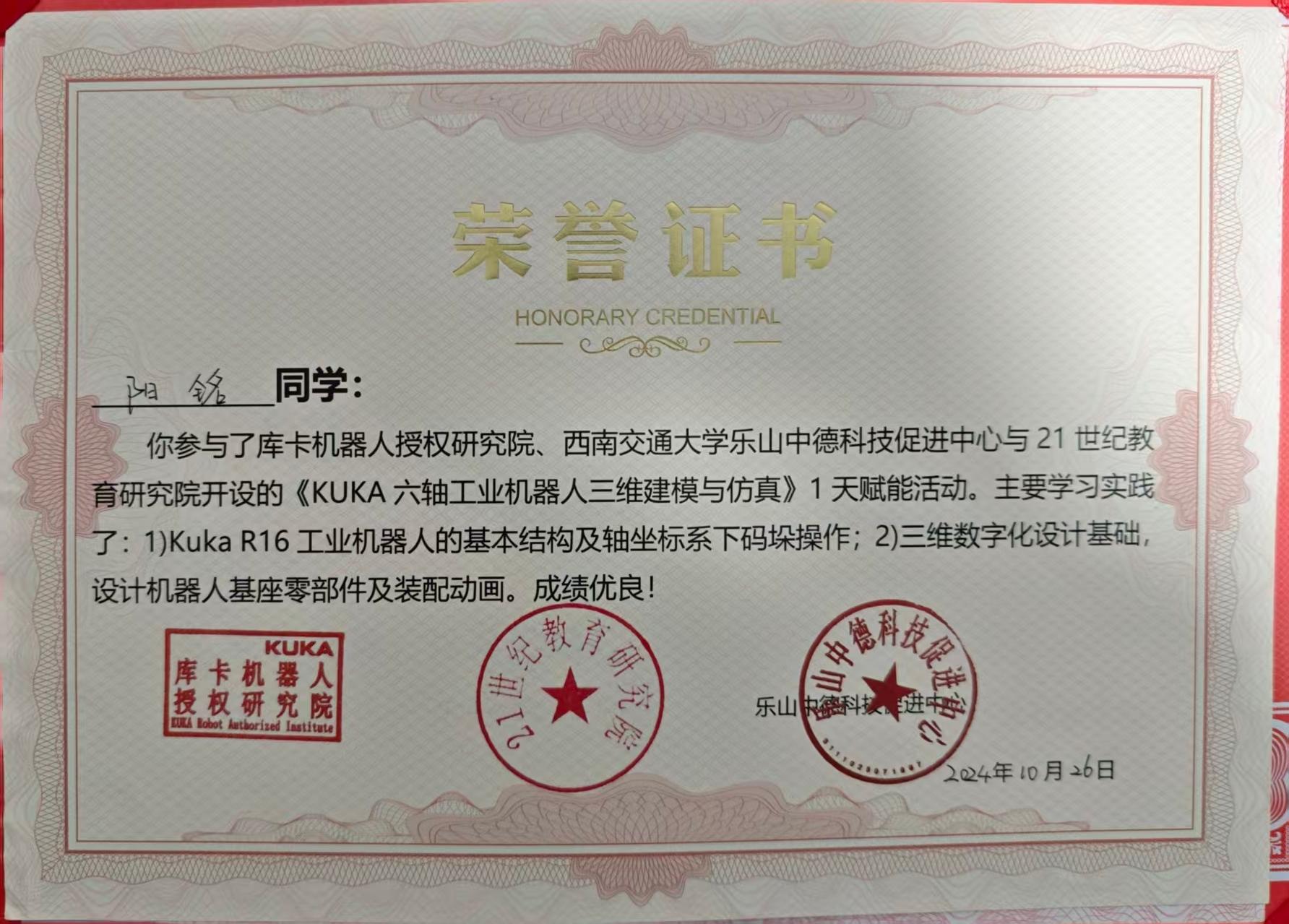 2024年10月获得“KUKA六轴机器人三维建模与仿真”荣誉表彰